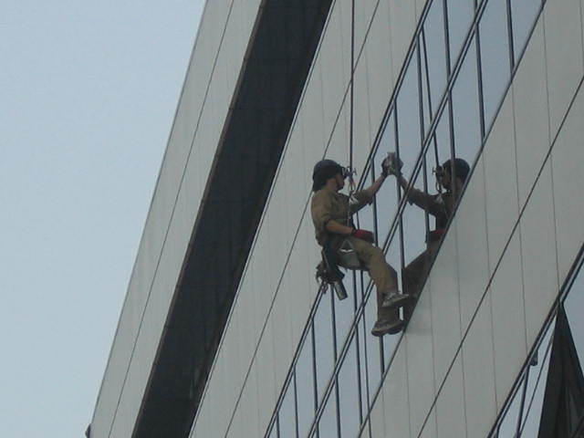 中央郵便局の窓掃除 ロープ1本で釣り下がって行ってました。